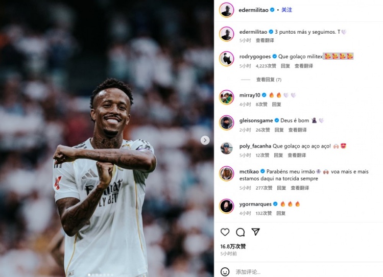 9月21日讯 皇马在本轮西甲焦点战2-0力克西班牙人,米利唐首发轰出精彩世界波。第22分钟,米利唐禁区外围接应巴尔韦德的传球,向前调整了两步后起脚抽射轰出世界波。他也在赛后通过社媒晒出自己的庆祝动作,T正是其妻子缇娜的首字母。米利唐还配文道:“拿下3分,继续前进。T”同胞罗德里戈也现身评论区:“多么甜蜜 ”。