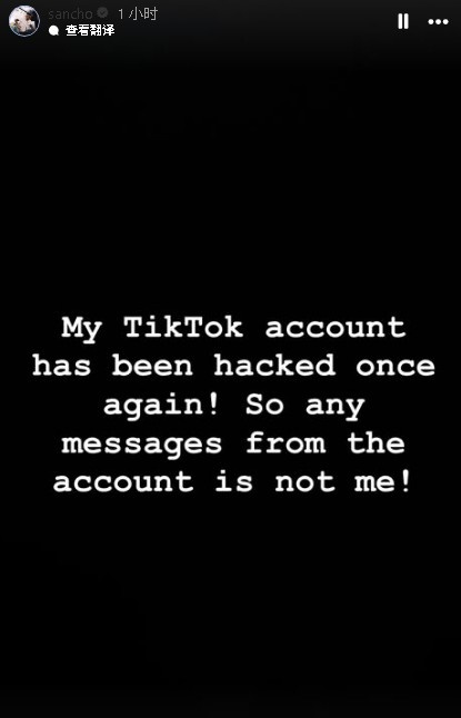 10月3日讯 桑乔在个人社交媒体上发布动态,表示自己的TikTok账号再一次被盗。桑乔写道:“我的TikTok账号又一次被盗了!所以任何来自该账号的消息都不是我本人发的!”去年8月,桑乔也曾发文称自己TikTok账号被盗。